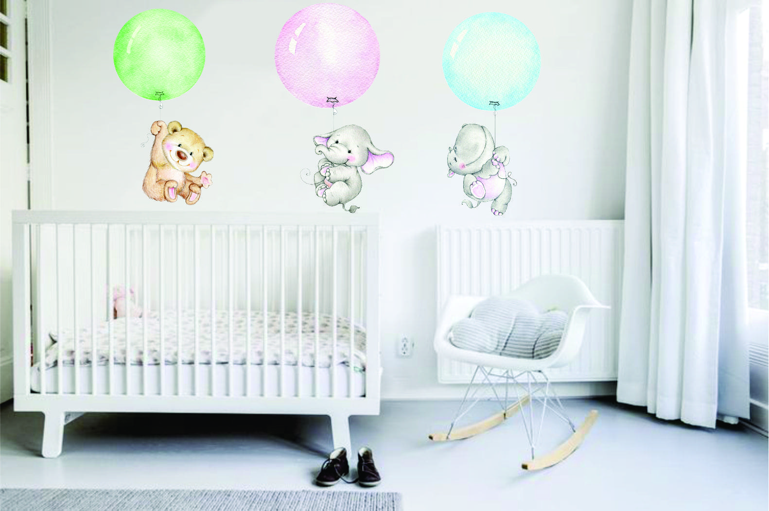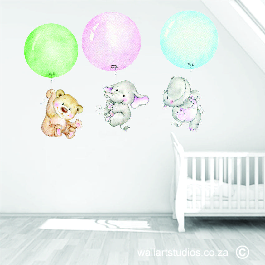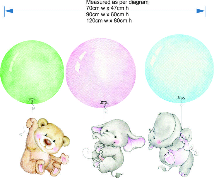 These cute little animals holding balloons cone separate so you can arrange on your wall as you please. See diagram for sizing or Contact Us for customisation.