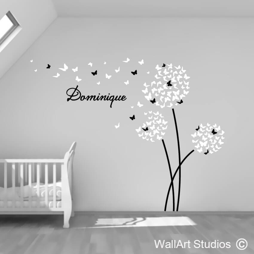 Butterfly Dandelions removable (not re-usable) vinyl Wall Sticker. When flipping to the right your name will be facing the correct way. You don’t have to have the name if you prefer not to. All our decals are custom made to order, if you would like a different size or additional colors you can email us your requirements info@wallartstudios.com