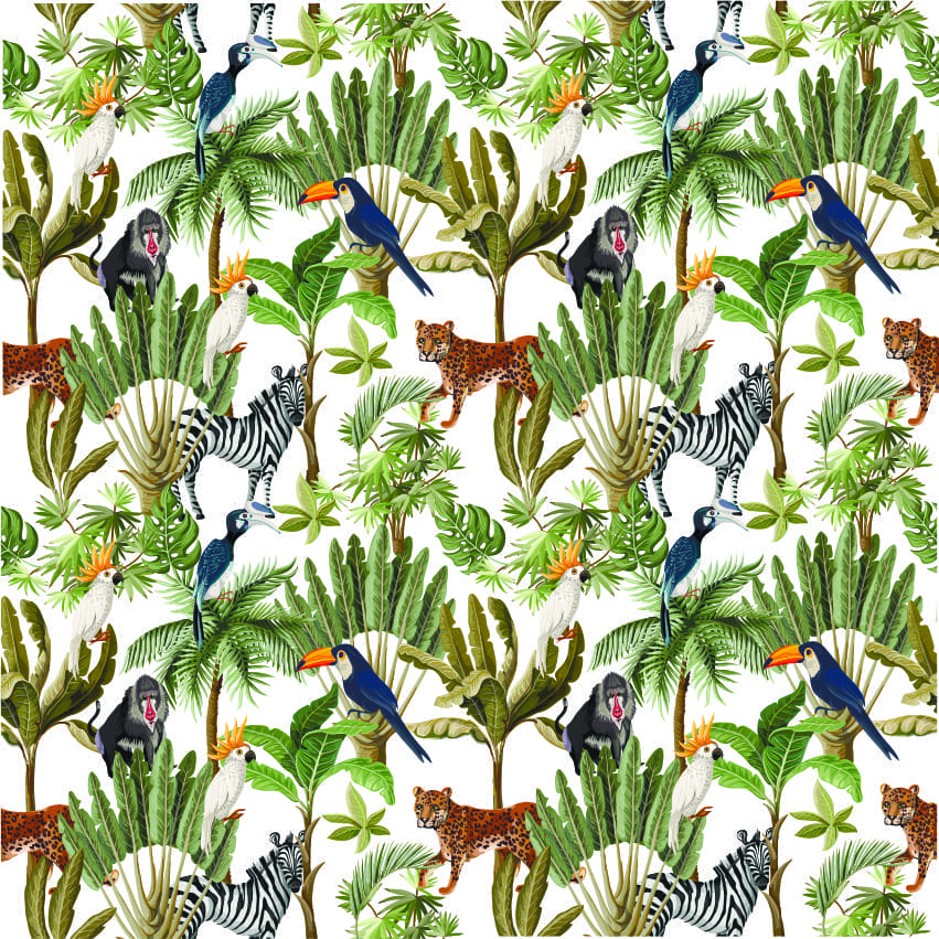 Exotic jungle wallpaper with white background is fun and looks great on the wall. All our wallpapers