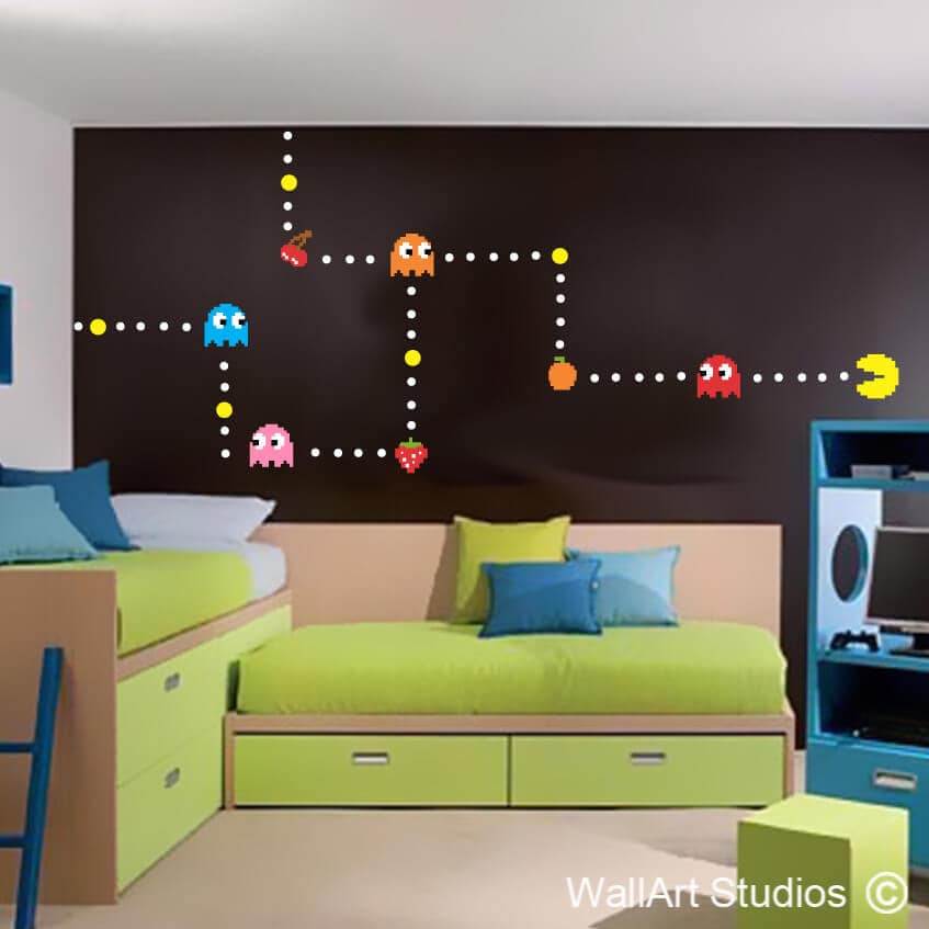 Pacman Wall Sticker. Sizes indicated for the height of the yellow Pacman and Inky, Pinky etc. We have arranged them as per the image but you can arrange them as you want! If you want to change the colors email us, info@wallartstudios.com