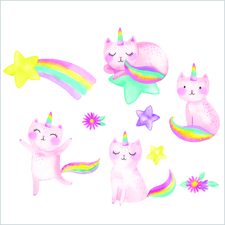 Rainbow, unicorn cats are a great way to liven up a wall, door, window or even a wardrobe, simply arrange these gorgeous kittens in the order you would like them. The lovely soft, pastel, water colours will go with most decor.