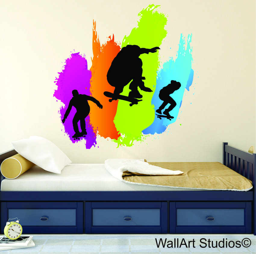 Skater Boys wall decal is a funky design for a sports or boys room, with its vibrant splashes of colour and silhouette outline of skater boys. For custom designs please Contact Us