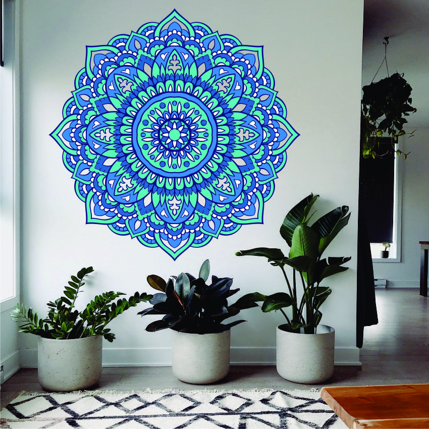 Turquoise Decorative Mandala Wall Sticker brightens and livens up a wall at minimal cost but with great effect. Easy to apply and remove without damaging your wall. For customised colours please Contact Us.