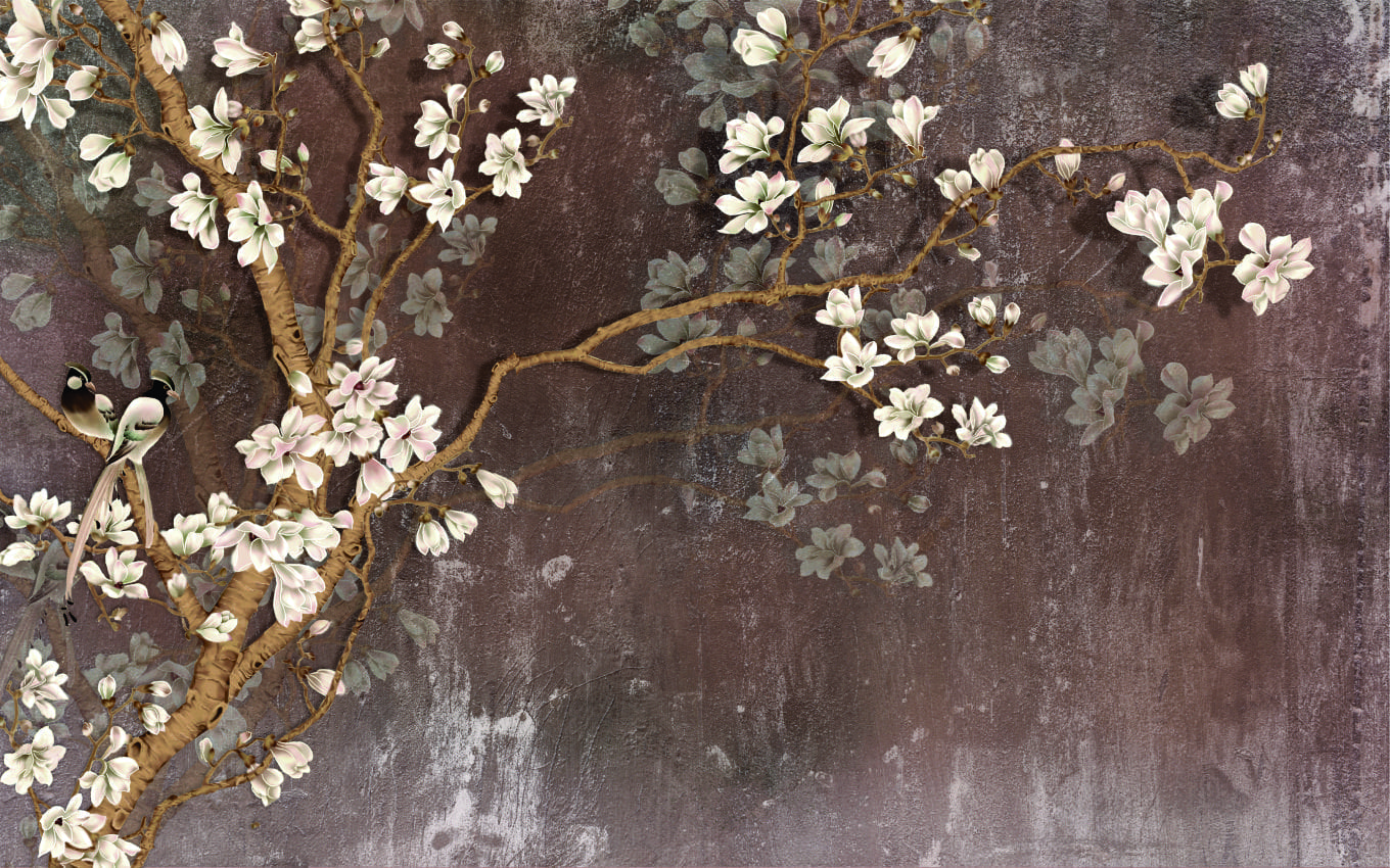 Beautiful wall mural with a branch of white flowers and birds against a textured wall.